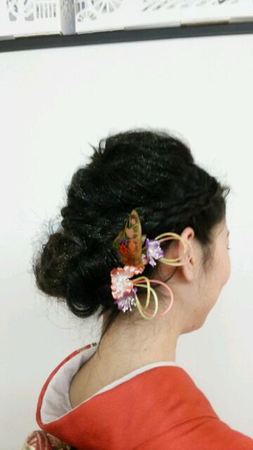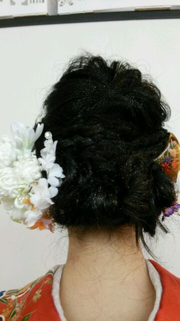 ヘアスタイルを拡大!!!(*´▽`*)ちょっと分かりにくいですが、右側サイドにはかんざし.左側サイドは大きめのお話を配置してます!!!( *´艸`)飾りが多いとホント便利!!!(#^.^#)