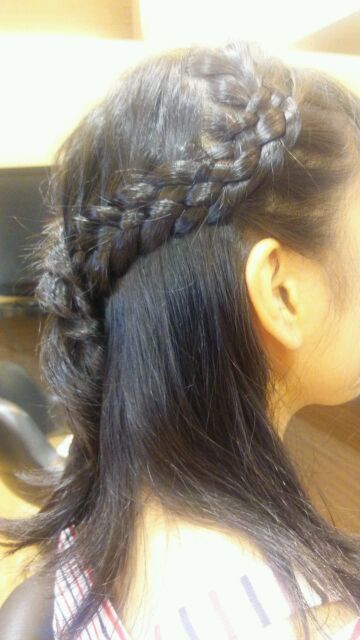 お得意の5つ編みですね(*´▽`*)パーマがかかっているので毛先はそのまま遊ばせればOK!!!5つ編みは美容室ならではのアレンジになりますが、自分で3つ編みをできるお客様でしたので、お家でも同じようなアレンジができると思います(^◇^)パーマはデザインが色々できて楽しいですね(*´▽`*)