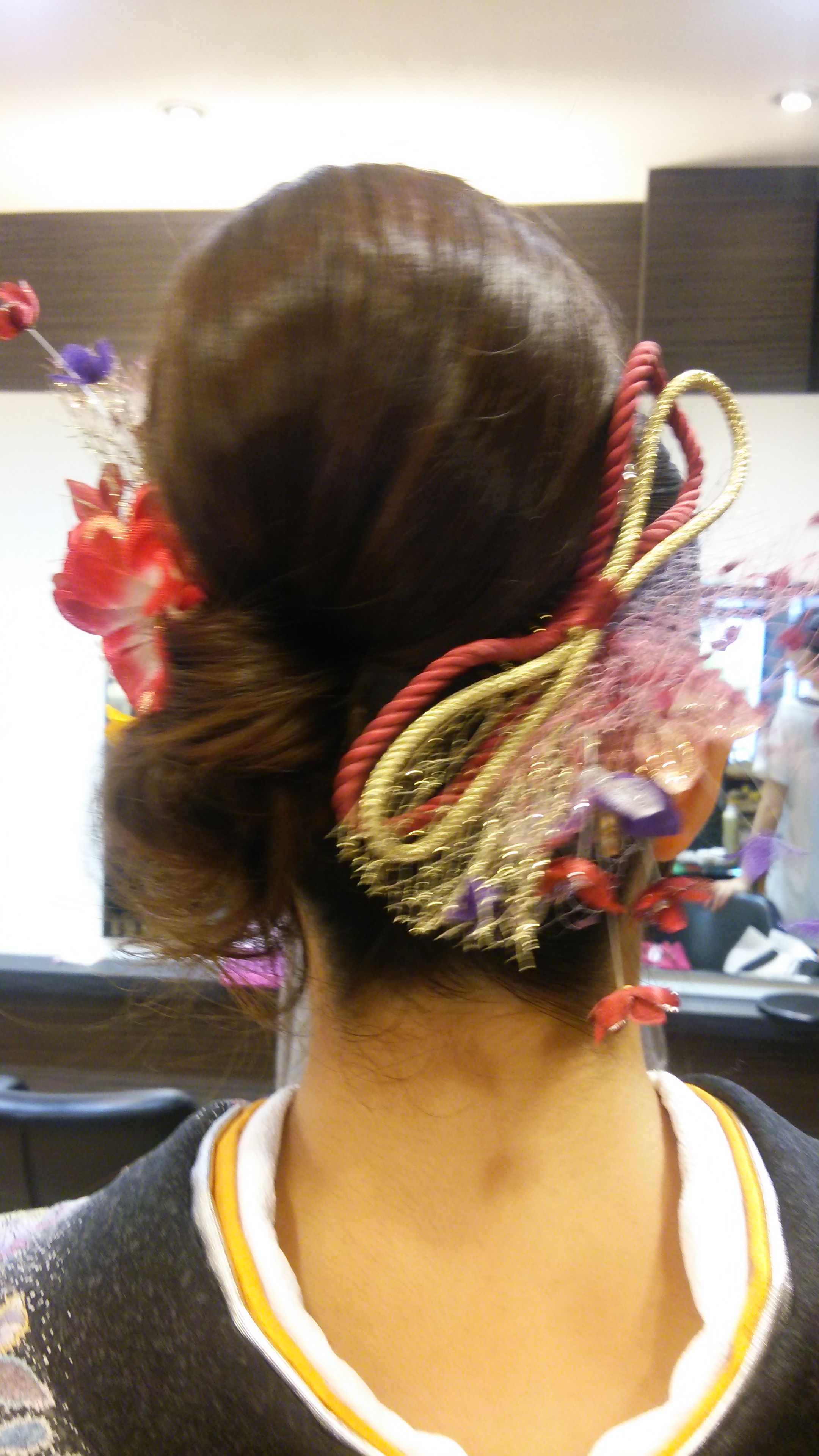 後ろからの図(*´▽`*)ハイそこの「私はもっと派手にしたい!!!」と思ったアナタ!!!キャロルからアドバイスです(^◇^)【前撮りの写真は和装でシックな感じのほうがイイ】ですよ(・ω・)ノなぜか!?それは【前撮りの写真は一生残るもの】なので、【流行りを取り入れすぎると、10~20年後に見るとダサく見える】からです(・ω・)ノ【流行りは必ず廃れます】ので、【一生モノの写真はオーソドックスが1番】です!!!流行り!?……今はやはり【編み込み】でしょうか?なので、前撮りの時は編み込みはあんまりおススメではないですね(。-`ω-)そんなこと言って流行りのスタイルを作れない言い訳じゃないの!?と思ったアナタ!!!ぜひホームページのギャラリーをご覧くださいm(__)m成人式当日の写真がいっぱいあります!!!編み込みはもちろん、ド派手なスタイルや奇抜なものまで色々です(^◇^)何が言いたいかというと、【個性的な好みのスタイルは成人式当日にやればイイ】んです(・ω・)ノデジカメか何かで写真を撮っとけば、1枚の着物で2種類のヘアスタイルの写真が手に入ることになりますね(*´▽`*)こっちの方が断然お得ではないでしょうか!?特に前撮りの写真は【万単位】のお金がかかってますので、これから先、末長~くいつでも見れる写真にしましょう!!間違っても【恥ずかしくて一生見たくない写真】にしないためにも、1度【和装】を心がけることをおススメします(・ω・)ノ…….成人式当日!?ド派手&個性のてんこ盛りでイイんです!!誰よりも目立たないと!!!!!こまけぇこたぁイイんだよ!!!(←台無し)