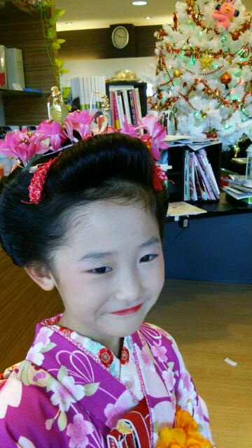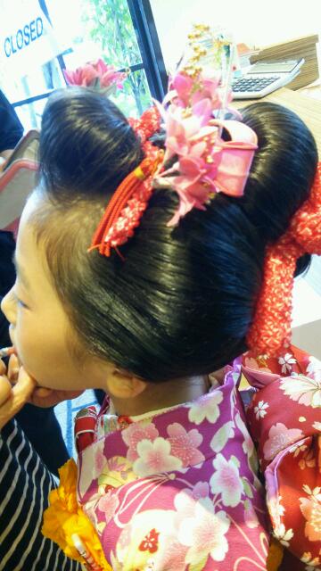 後ろから!!!7歳にもなると毛がそろっているからサマになりますね(*´▽`*)お子様の着付けとかやってる間、ヒマ~~だったのでついでにお母さんの頭をいじってみました(*´▽`*)ではこちら(^_-)-☆