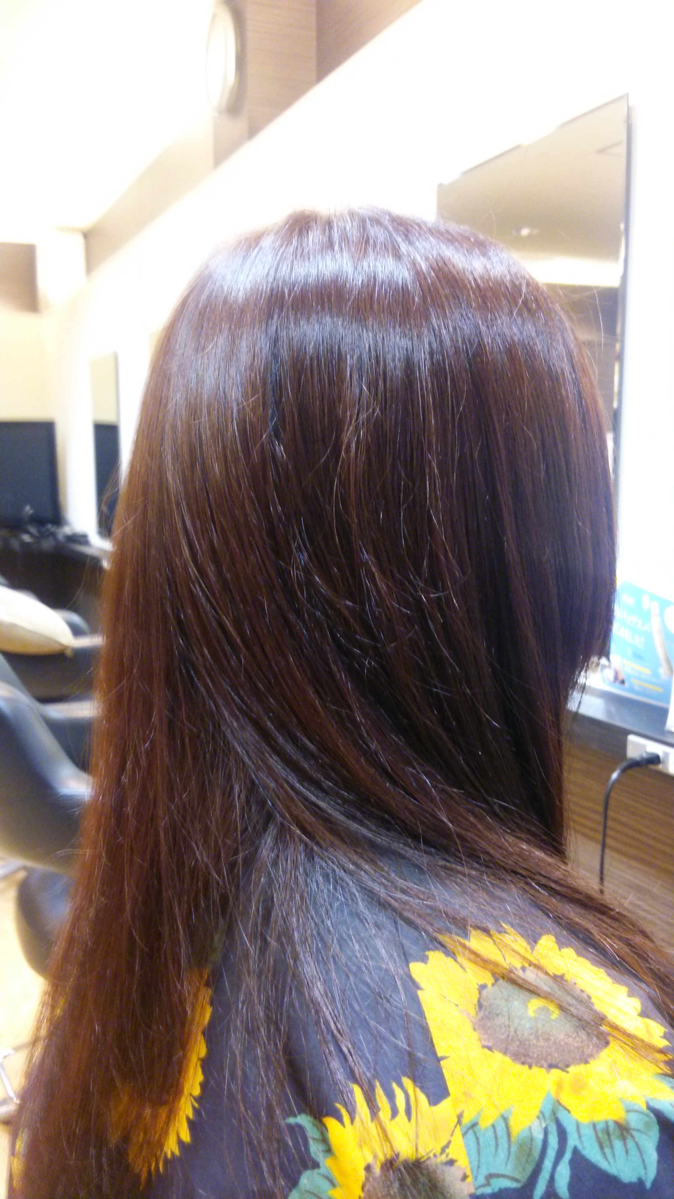 本日はベルベットレッドをご紹介します(*´▽`*)赤と聞くと皆様敬遠しがちですが……(。-`ω-)ベルベットレッドだと色味が結構抑えられるので、毛先までつややかな落ち着いた赤になりますね(*´▽`*)髪のパサつきや、色味の退色を抑えるのにも役立ちますよ(・ω・)ノ写真でもお分かりだと思いますが、暗めの赤って落ち着いた雰囲気が出やすいです(^◇^)今までやったことのない方はこれを機に色味を楽しんでみませんか?もちろん、白髪染めでもベルベットカラーはおススメ(・ω・)ノむしろ相性がイイですよ!!!