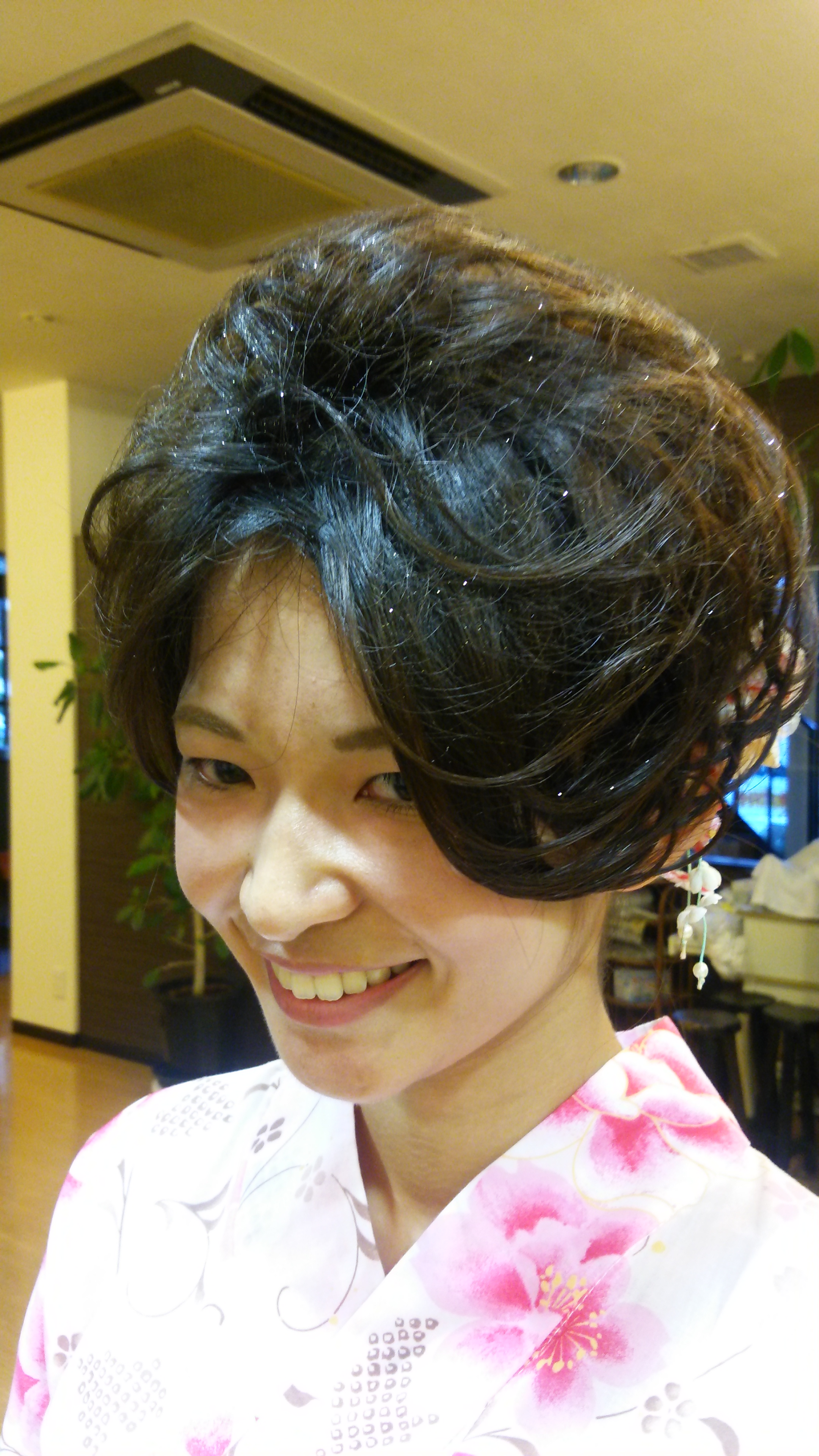 さあ、やってまいりました!!!本日は!!永らく話のネタにしていました、甘木川花火大会です!!今日は浴衣の着付けとセットアップで7名ものお客様に来ていただきましたm(__)m中には遠くからも来ていただいたお客様もいらっしゃってました(*´▽`*)本当にありがとうございましたm(__)mでは、恒例になりました( *´艸`)今日のアップスタイルを載せてみましょう!!またもや全員写真を撮り忘れたのですが……(。-`ω-)まずは載せれるだけね!!では!!(^_-)-☆