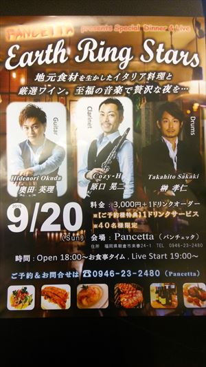 最近、よく行くようになった朝倉のPANCETTAさんで9月にDinner&Liveをやるみたいです(^◇^)こんな日にちょっとオシャレして行ってみるのも普段と違う楽しみとしてはイイんじゃないですか?(#^.^#)
