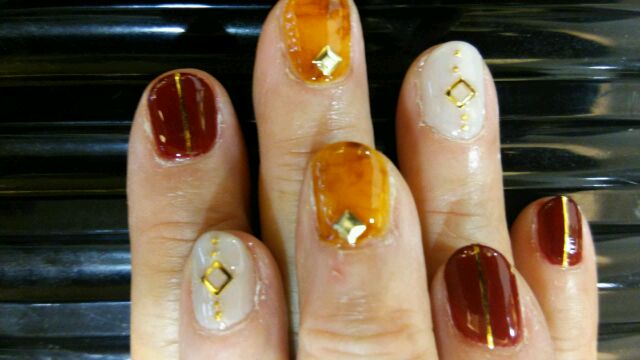 こちらのお客様は琥珀+鼈甲系のネイルですね(*´▽`*)このコンビネーションはご年配のお客様に大変人気になってます!!!(^◇^)
