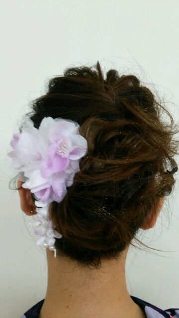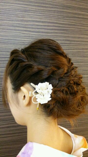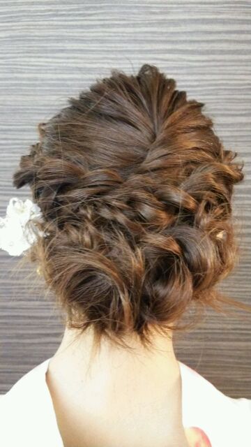 特に髪飾りをお持ちでは無かったので、編み込みを使ってコサージュをON!!!(^◇^)右と左で印象に違いが出て、シックだけど面白味のあるスタイルになりますね(*´▽`*)ではまた火曜日(・ω・)ノ