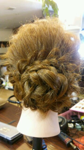 でも、今日もビミョーに忙しくて店長はあんまり指導には参加できませんでしたが……(;^ω^)なので、相モデルでお互いのヘアアレンジが終わったら、昨日のように課題をやってもらいました!!!( *´艸`)んで、出来上がったスタイルがこちら(^_-)-☆