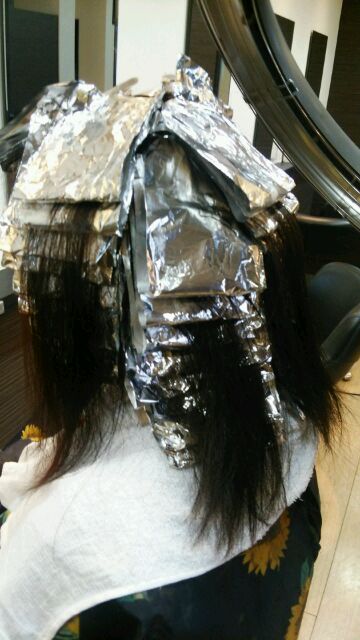 「前頭ブリーチ」ではなく「「髪の毛の間を細かく間引くようにブリーチ」するんですね(*´▽`*)流した後、アッシュグレーをON!!!すると、写真の黒髪が……(^_-)-☆