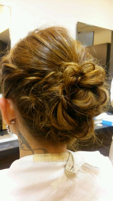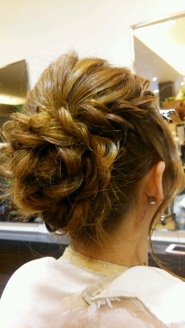 サイドのこの感じは最近よく使ってます!!!お客様にもよく聞かれるんですが、正体は実はただの2つ編み込み崩しだったりします(;^ω^)やるコツ!?カンタンですよ(・ω・)ノ端的に表すと「雑巾絞り」と同じ……って表現がなあ……(;^ω^)
