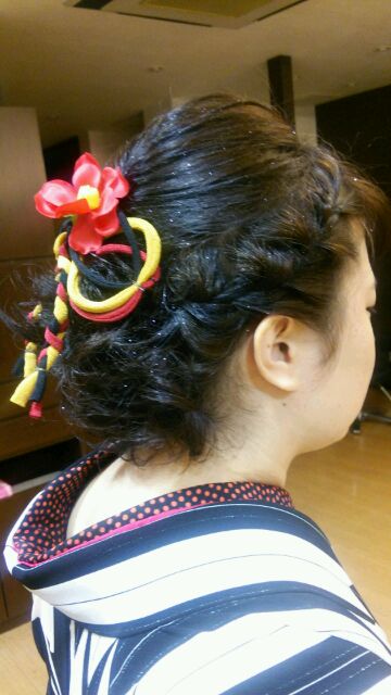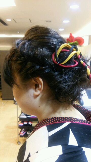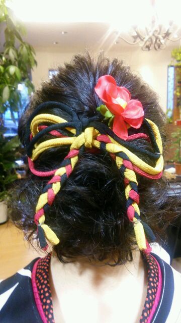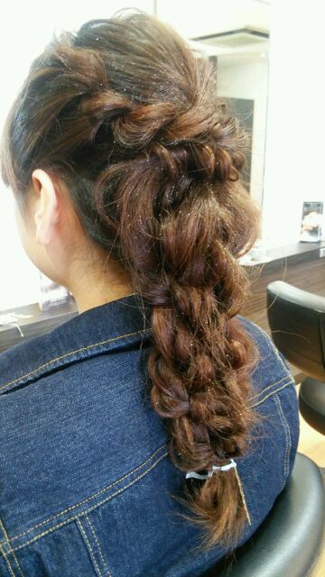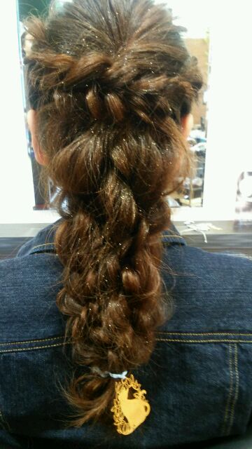 ハイ、こちらもキャロルではお馴染み、「ラプンツェルヘアー」です(*´▽`*)こちらのお客様は特に飾りが無かったので、ゴムで縛った部分にお店で使ってる飾りを付けてみました(*´▽`*)