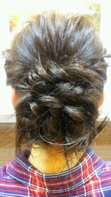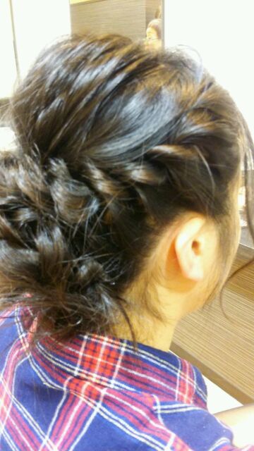 違いは襟足の長い髪を編み込んで、グルグルっと巻き付けただけです(*´▽`*)後はアメリカピンでバランスを見ながら固定(・ω・)ノ