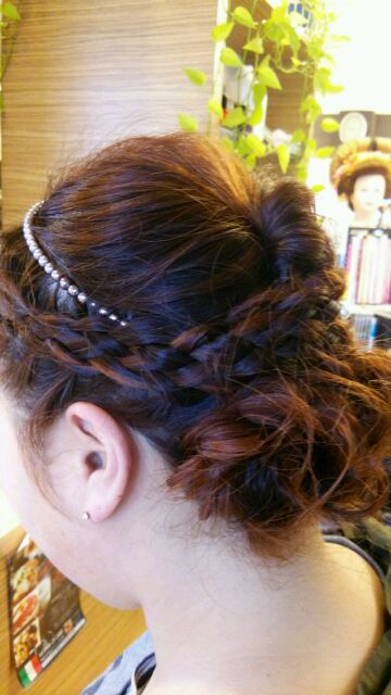 飾りは「カチューシャ」と5つ編み込みに「パール」を這わせて「ダブルカチューシャ」に(*´▽`*)